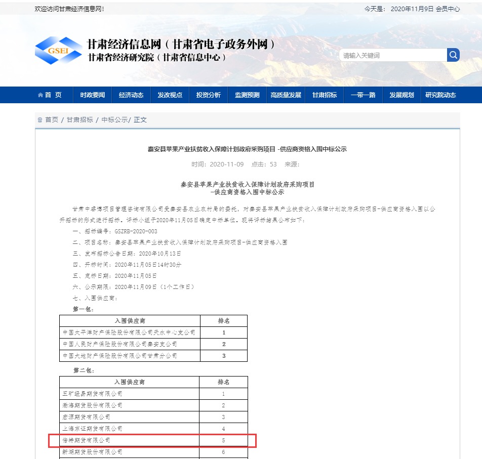 2020年10月13日,甘肅省秦安縣農業(yè)農村局對秦安縣蘋果產業(yè)扶貧收入保障計劃政府采購項目-供應商資格入圍以公開招標方式進行采購,招標內容擬中標期貨公司的數量為15家。倍特期貨有限公司在第一時間得知招標信息后,認真準備招標材料,為秦安縣種植蘋果的貧困戶、小農戶和新型農業(yè)經營主體精心設計場外期權方案,以更好的規(guī)避蘋果價格下跌的風險,體現精準扶貧的政治擔當。瀏覽 : 32520分享