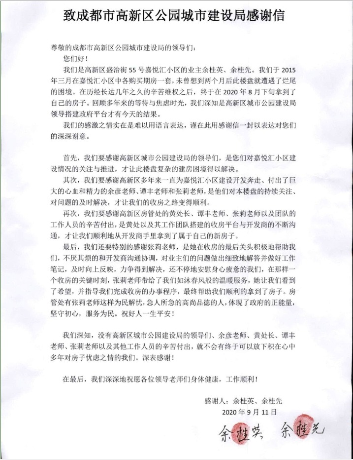 近日,由成都倍特建筑安裝工程有限公司承建的嘉悅匯A標(biāo)段,歷經(jīng)多方努力,已基本完成了小業(yè)主的交付工作。2020年9月11日,高新發(fā)展法務(wù)部借調(diào)到公園局的張莉同志收到來自嘉悅匯小業(yè)主余桂先、余桂英兩位女士贈(zèng)送的繡有“為民解憂、盡職盡責(zé)”、“思民生、解民難、做實(shí)事、暖民心”的錦旗及表揚(yáng)信。兩位業(yè)主對(duì)張莉同志所提供的服務(wù)給與了高度的贊揚(yáng)和誠摯的感謝。瀏覽 : 13175分享